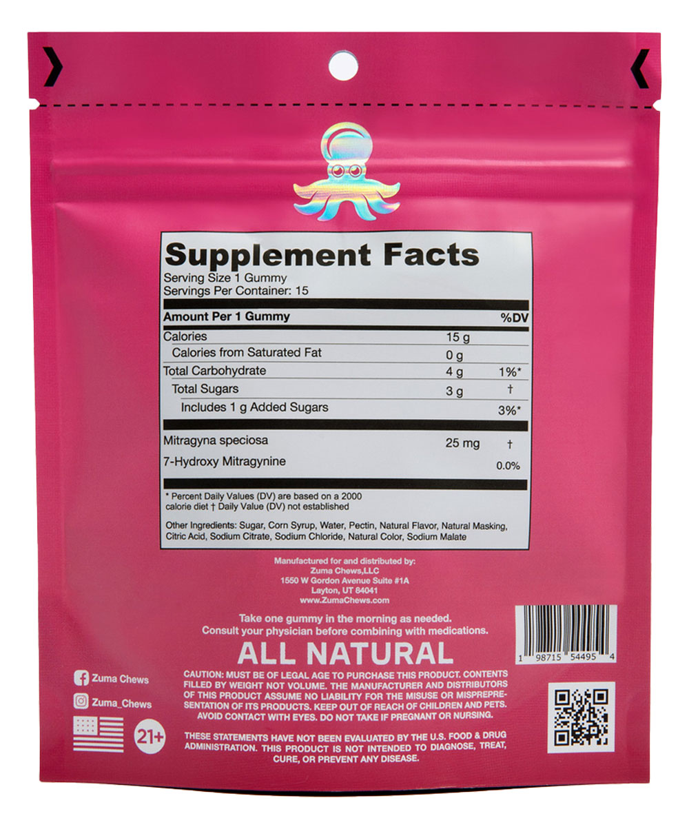 Ingredients: Mitragyna Speciosa, Sucrose, Glucose Syrup, Water, Pectin, Natural Flavor, Natural Masking, Citric Acid, Sodium Chloride, Natural Color, Sodium Malate